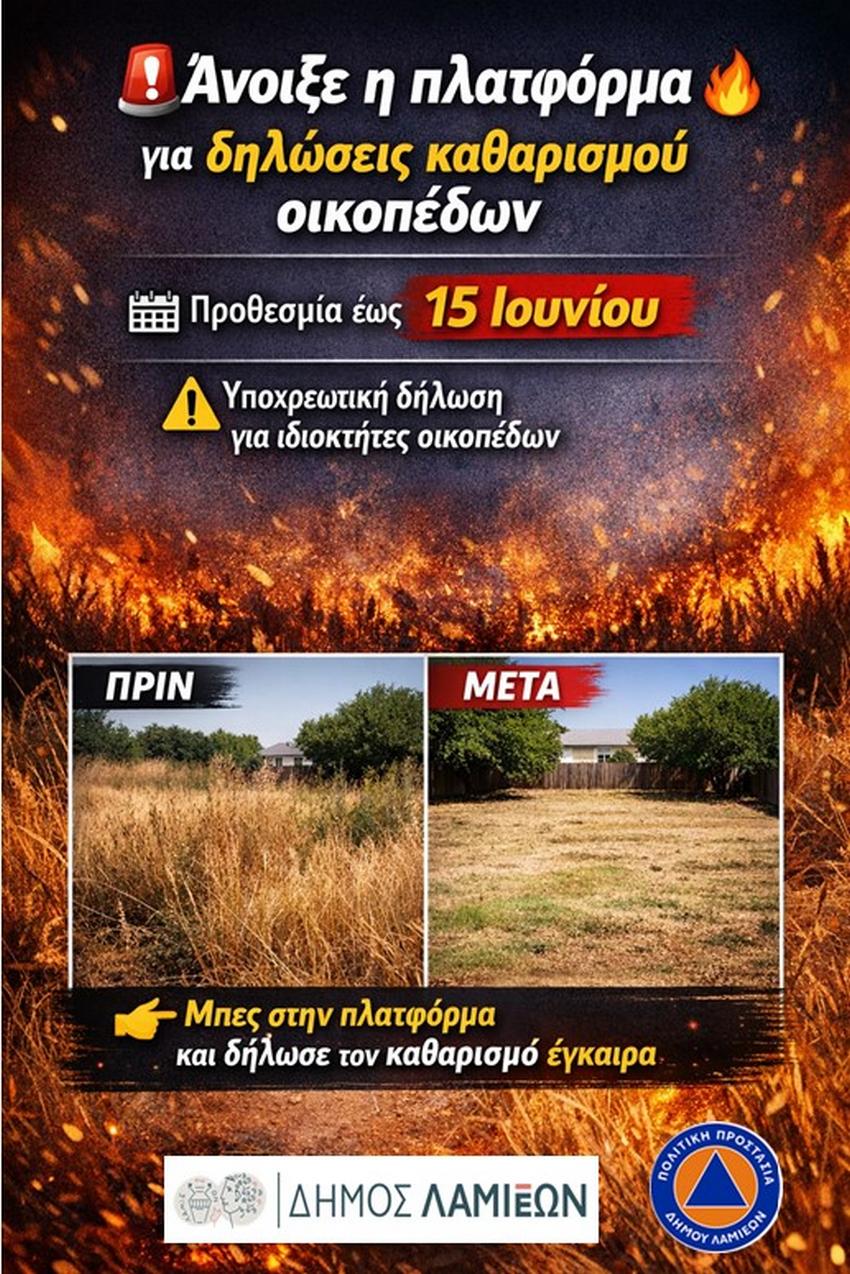 Το Αυτοτελές Τμήμα Πολιτικής Προστασίας του Δήμου Λαμιέων ενημερώνει τους δημότες ότι, ενόψει της έναρξης της αντιπυρικής περιόδου 2026 (01 Μαΐου - 31 Οκτωβρίου 2026), όλοι οι ιδιοκτήτες, νομείς, επικαρπωτές, μισθωτές ή υπομισθωτές οικοπέδων και ακάλυπτων χώρων υποχρεούνται να προχωρήσουν εγκαίρως στον καθαρισμό των ιδιοκτησιών τους, με στόχο την πρόληψη εκδήλωσης πυρκαγιών και την προστασία της ανθρώπινης ζωής, της περιουσίας και του φυσικού περιβάλλοντος.
