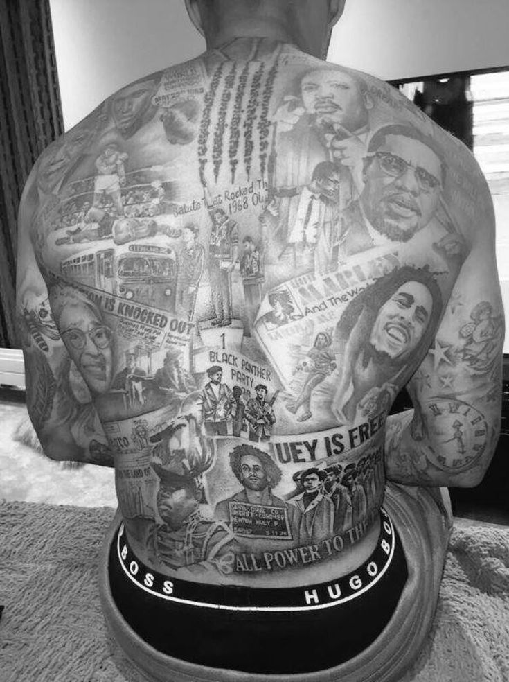 Ο 26χρονος επιθετικός έκανε ένα τεράστιο τατουάζ στο οποίο απεικονίζονται οι Μπομπ Μάρλεϊ, Μάρτιν Λούθερ Κινγκ, Οι Μαύροι Πάνθηρες (μέσω της θρυλικής φωτογραφίας των Σμιθ και Κάρλος), ο Νέλσον Μαντέλα, ο Μοχάμεντ Αλι, ο Μάλκολμ Χ, η Ρόζα Παρκς και άλλοι διάσημοι μαχητές και διανοητές του μαύρου κινήματος!