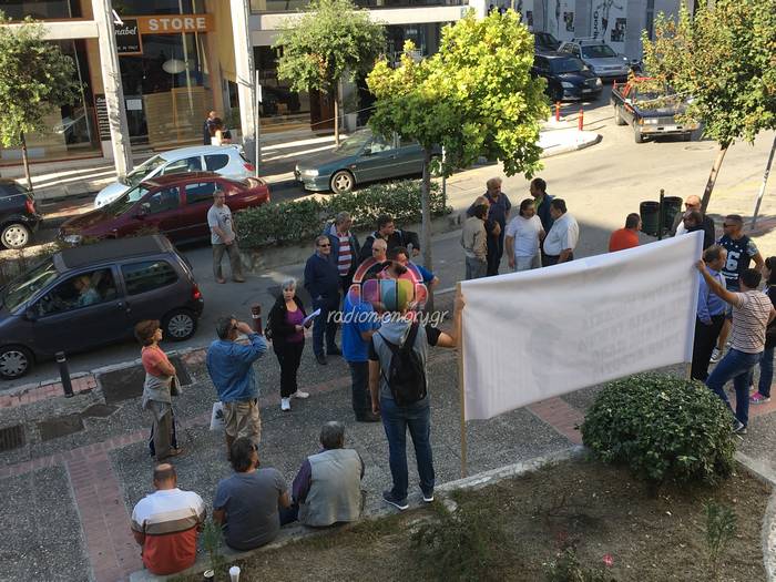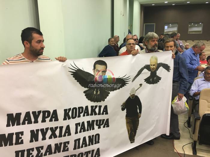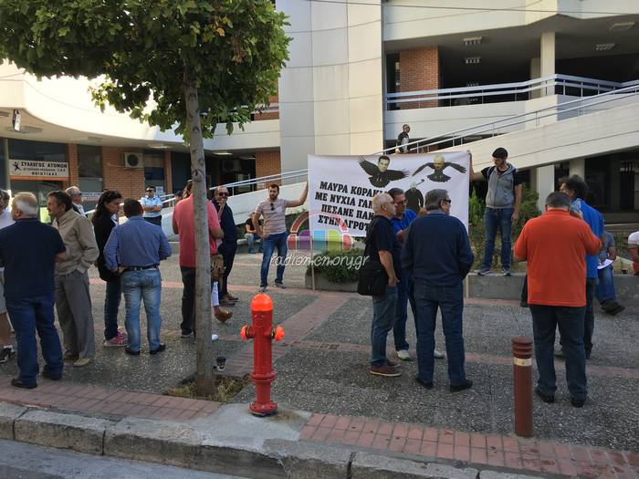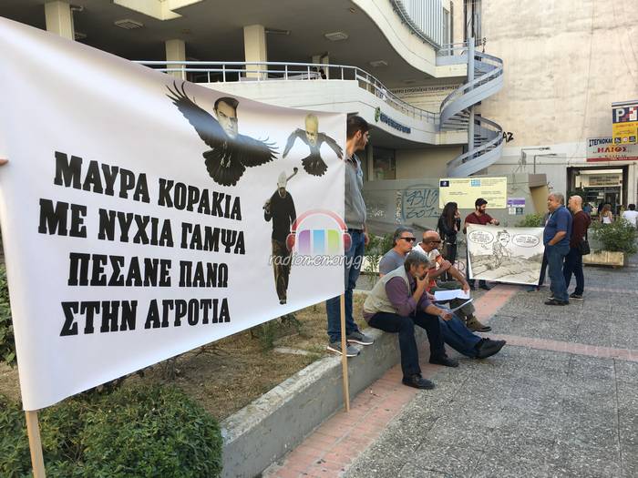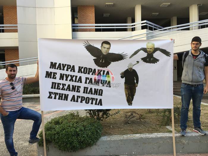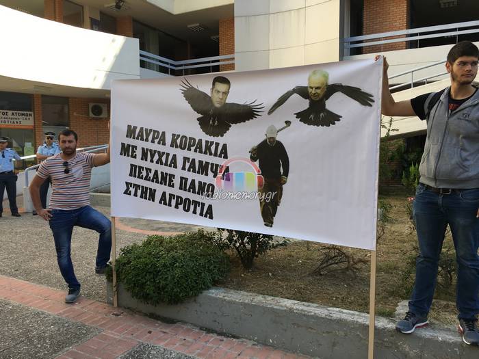 Απο νωρίς το πρωί  αγρότες της ΠΑΣΥ και απο την Ανθήλη είχαν συγκεντρωθεί έξω απο το κτίριο  και είχαν αναρτήσει πανώ διαμαρτυρίας χαρακτηρίζοντας τον υπουργό αλλά και τον Πρωθυπουργό μαύρα κοράκια της αγροτιάς .