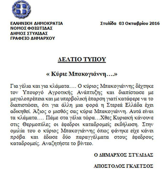 Επίθεση του Δημάρχου Στυλίδας και προέδρου της παράταξης ΤΕΛΕΙΑ Απόστολου Γκλέτσου στον Περιφερειάρχη Στερεάς Κώστα Μπακογιάννη .