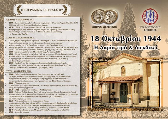 Οι εκδηλώσεις που έχει προγραμματίσει η δημοτική αρχή της Λαμίας ξεκινούν την Κυριακή 16 Οκτωβρίου με την συνεδρίαση του δικτύου μαρτυρικών πόλεων και κορυφώνονται την Τρίτη 18 Οκτωβρίου με Πολυαρχιερατική Θεία Λειτουργία στο νέο Ιερό Ναό του Αγίου Αποστόλου & Ευαγγελιστού Λουκά Προεξάρχοντος του Σεβασμιωτάτου Μητροπολίτου Καστορίας κ.κ. Σεραφείμ με τη συμμετοχή των Σεβασμιωτάτων Μητροπολιτών Ελευθερουπόλεως, κ.κ. Χρυσοστόμου και Φθιώτιδος κ.κ. Νικολάου.