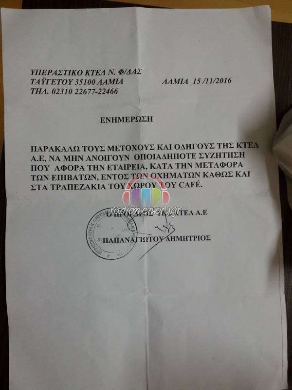 Σύμφωνα με τα όσα αναγράφονται σε αυτήν , την οποία βλέπετε σε φωτογραφία που μας έστειλε αναγνώστης , απαγορεύεται οποιαδήποτε συζήτηση στους μετόχους και στα μέλη της ΚΤΕΛ Α.Ε. κατά την μεταφορά των επιβατών ή στους χώρους του κυλικείου σχετικά με τα θέματα της εταιρείας .