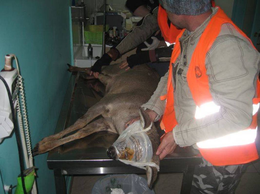 Το ζώο ήταν σε κακή κατάσταση με σχεδόν αποκομμένο το πίσω αριστερό του πόδι, τρύπες σε πολλά σημεία του σώματος, πιθανά από σκάγια, και πληγή στο πίσω μέρος του σώματος.