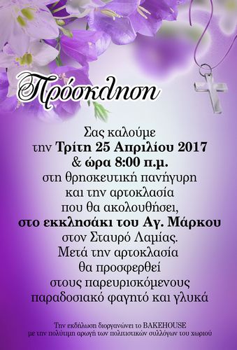 Σας προσκαλεί όλους να παραστείτε στην θεία λειτουργία και την αρτοκλασία που θα ακολουθήσει ενώ και φέτος θα υπάρχει φαγητό και κρασί.