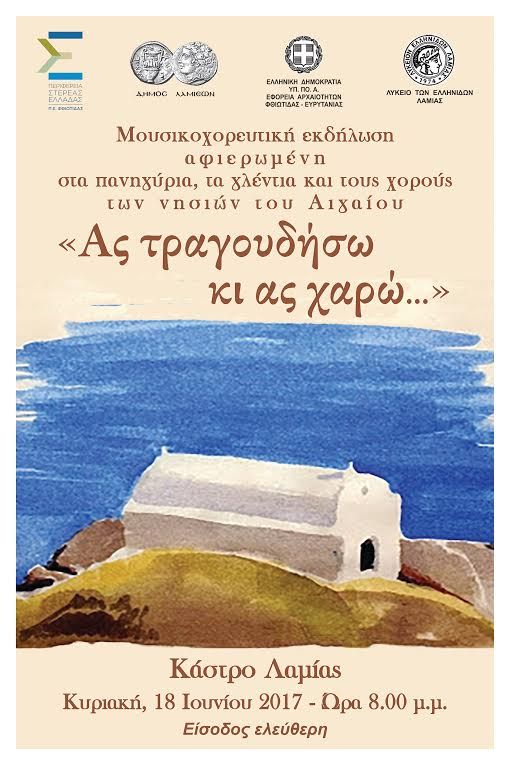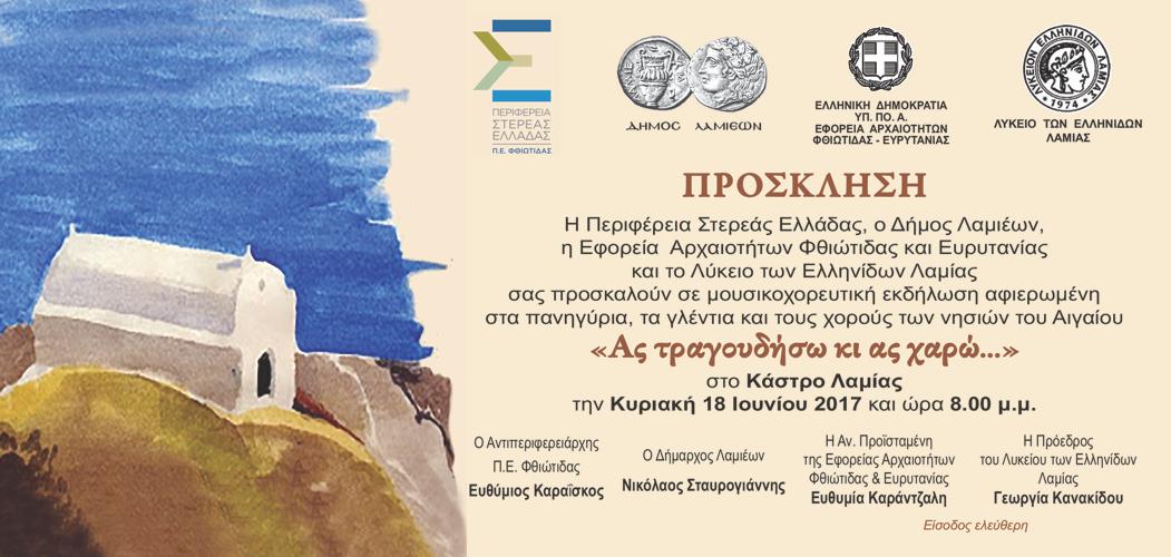 Το Λύκειο Ελληνίδων Λαμίας θέλοντας να παρουσιάσει στους συμπολίτες μας κάτι ξεχωριστό από τον πλούτο της λαϊκής μας παράδοσης θα πραγματοποιήσει μια εκδήλωση αφιερωμένη στα πανηγύρια και τα γλέντια των νησιών του Αιγαίου.