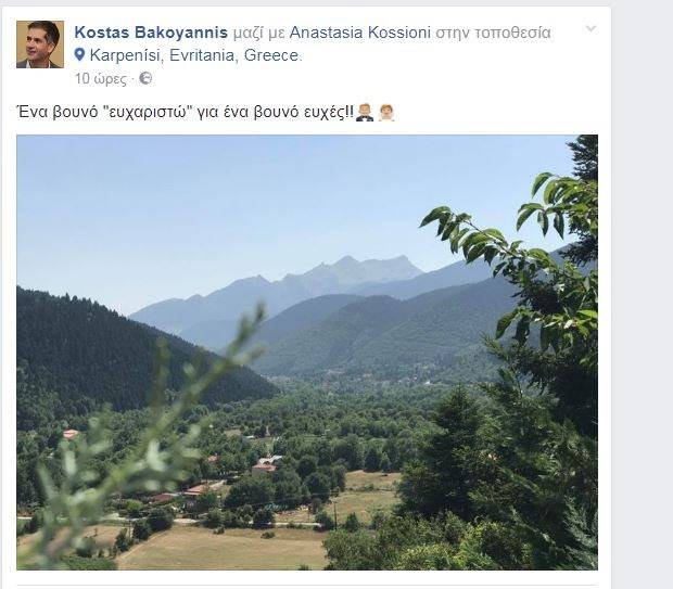 Με μια ανάρτηση στον λογαριασμό του στο facebook, o Περιφερειάρχης Στερεάς Ελλάδας Κώστας Μπακογιάννης ευχαριστεί όλους όσοι έστειλαν τις ευχές τους για τον γάμο του με την Σία Κοσιώνη.