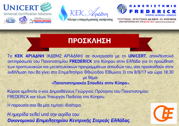 Το Κ.Ε.Κ. Αριάδνη σε συνεργασία με τη Unicert, αποκλειστικό αντιπρόσωπο του Πανεπιστημίου FREDERICK της Κύπρου στην Ελλάδα, διοργανώνει εκδήλωση με θέμα «Πανεπιστημιακές Σπουδές στη Κύπρο» στα πλαίσια των ημερών γνωριμίας (Open Days) του Πανεπιστημίου FREDERICK, την Παρασκευή 8 Σεπτεμβρίου 2017 και ώρα 18:30 στην αίθουσα εκδηλώσεων του Επιμελητηρίου Φθιώτιδας, (Όθωνος 3).
