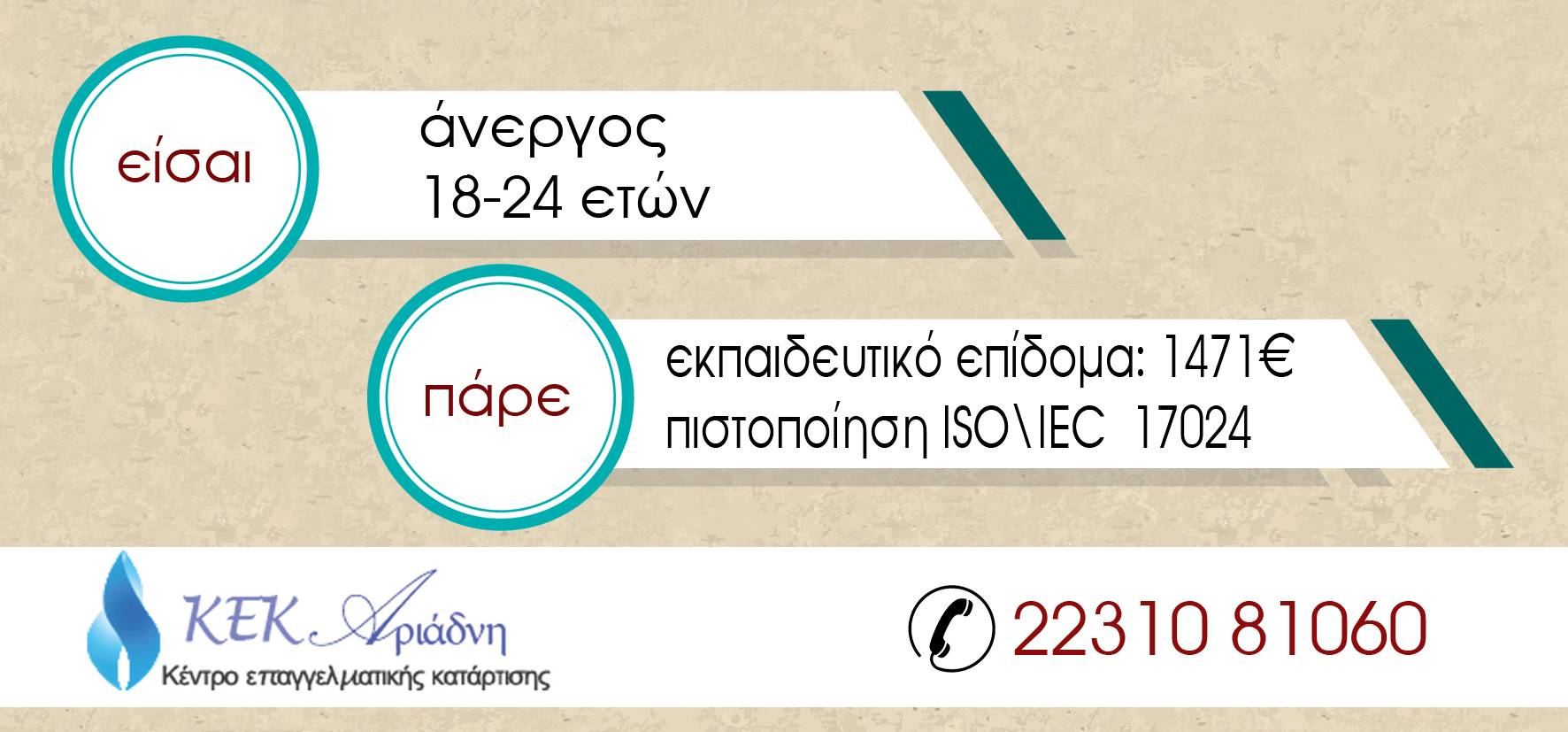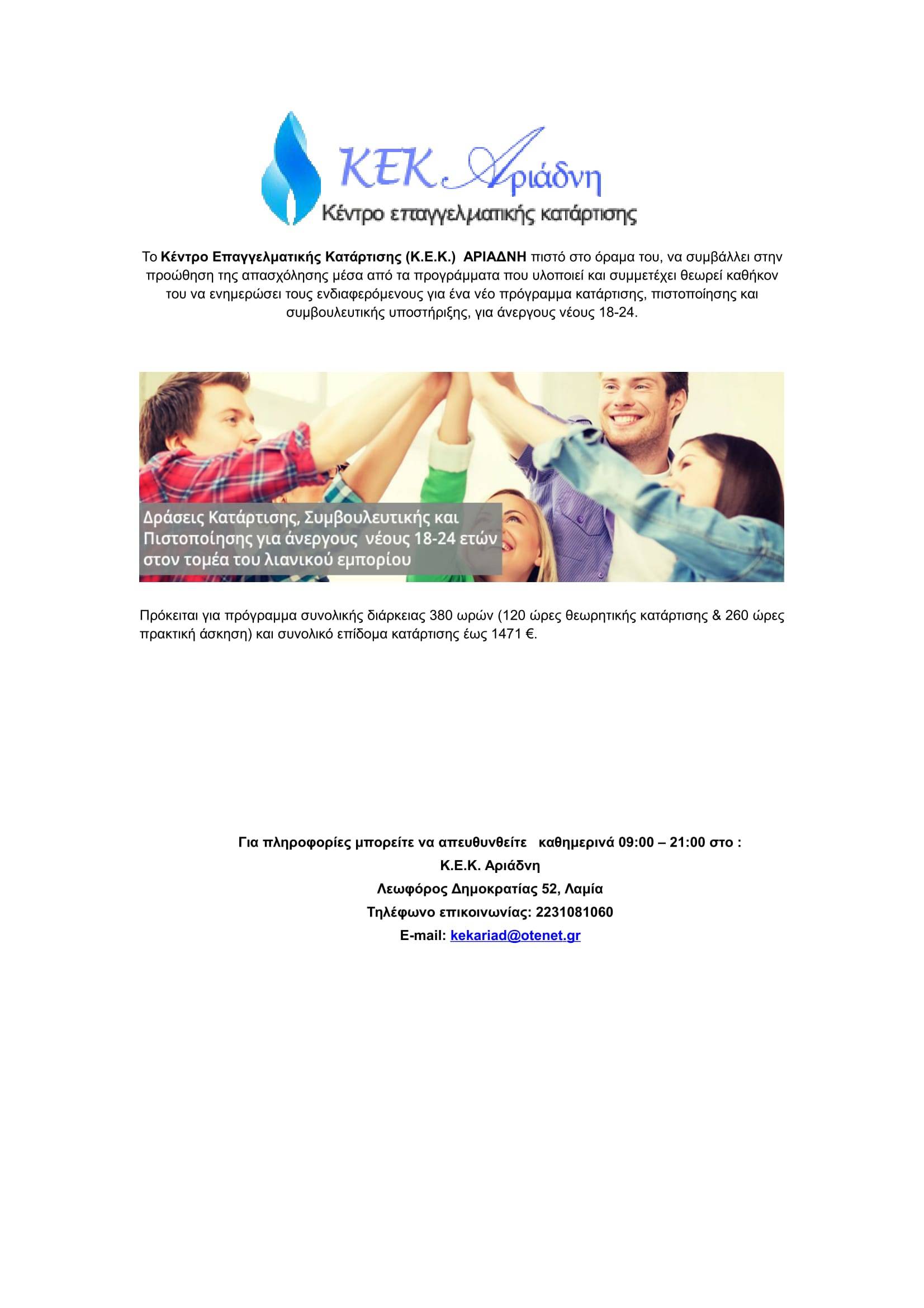 Το Κέντρο Επαγγελματικής Κατάρτισης (ΚΕΚ) Αριάδνη υλοποιεί ένα νέο πρόγραμμα κατάρτισης, πιστοποίησης και συμβουλευτικής υποστήριξης για ανέργους 18-24 ετών.