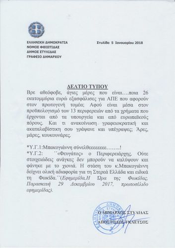 Ο δήμαρχος Στυλίδας χαρακτηρίζει τον περιφερειάρχη << φευγάτο >> και επισημαίνει στην ανακοίνωσή του πως τα χρήματα δεν τα εξασφάλισε η περιφέρεια αλλά είναι από κρατικούς πόρους μέσα στον προϋπολογισμό για τις 13 περιφέρειας της χώρας .