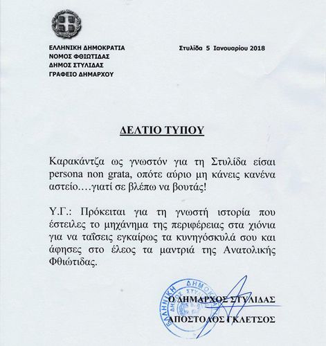 Με αφορμή τον εορτασμό των θεοφανείων στην Στυλίδα ο δήμαρχος Απόστολος Γκλέτσος προχώρησε σε ανακοίνωση καλώντας , ούτε λίγο ούτε πολύ , να μην πατήσει το πόδι του στην Στυλίδα .