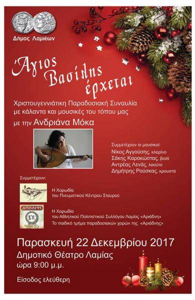 Ο Δήμος Λαμιέων σας προσκαλεί στην Χριστουγεννιάτικη παραδοσιακή συναυλία «Άγιος Βασίλης έρχεται» με κάλαντα και μουσικές του τόπου μας που θα πραγματοποιηθεί την Παρασκευή 22 Δεκεμβρίου 2017 και ώρα 21:00 στο Δημοτικό Θέατρο Λαμίας.