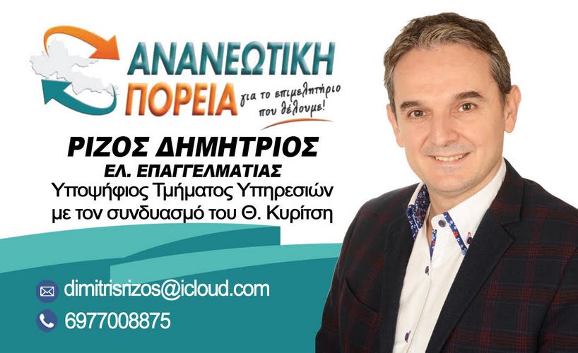 Ο Δημήτρης Ρίζος συμμετέχει στο ψηφοδέλτιο "ΑΝΑΝΕΩΤΙΚΗ ΠΟΡΕΙΑ" με τον συνδυασμό του Θανάση Κυρίτση.