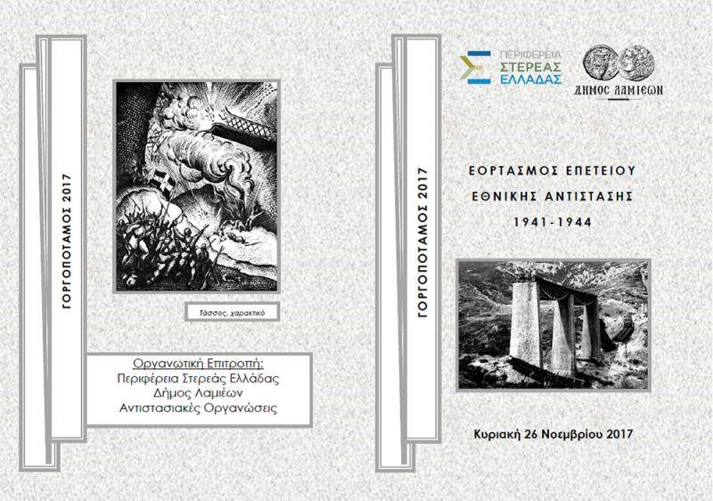 Την Κυριακή 26 Νοεμβρίου 2017, στο Γοργοπόταμο, πρόκειται να πραγματοποιηθεί ο Πανελλήνιος Εορτασμός της Εθνικής Αντίστασης από την Περιφέρεια Στερεάς Ελλάδας, το Δήμο Λαμιέων και Αντιστασιακές Οργανώσεις, για την απόδοση του οφειλόμενου φόρου τιμής στους Αγωνιστές της Εθνικής Αντίστασης 1941-1944.