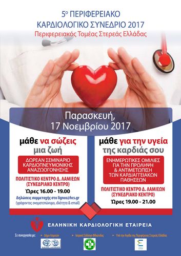 Η Ελληνική Καρδιολογική Εταιρεία, μία από τις μεγαλύτερες επιστημονικές εταιρείες της χώρας, και η Ελληνική Εταιρεία Χειρούργων Θώρακος, Καρδιάς, Αγγείων, στη συνεχή προσπάθειά για τη μετάδοση επίκαιρης γνώσης και την ανταλλαγή νέων δεδομένων που αφορούν τη διάγνωση, την πρόληψη και τη θεραπεία των καρδιαγγειακών παθήσεων, επέλεξαν την πόλη της Λαμίας για να διοργανώσουν το 5ο Περιφερειακό Καρδιολογικό Συνέδριο Στερεάς Ελλάδας (17-18 Νοεμβρίου), σε συνεργασία με τον Δήμο Λαμιέων, τον Ιατρικό Σύλλογο Φθιώτιδας και υπό την Αιγίδα της Περιφέρειας Στερεάς Ελλάδας.