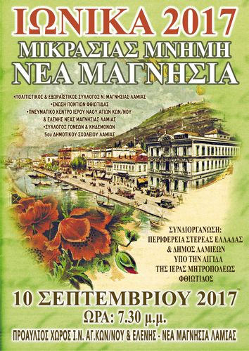 Ο Δήμος Λαμιέων, η Περιφέρεια Στερεάς Ελλάδας, ο Πολιτιστικός και Εξωραϊστικός Σύλλογος Νέας Μαγνησίας, η Ένωση Ποντίων Φθιώτιδας, το Πνευματικό Κέντρο Ιερού Ναού Αγίων Κωνσταντίνου και Ελένης και ο Σύλλογος Γονέων και Κηδεμόνων 5ου Δημοτικού Σχολείου σας προσκαλούν στα «Ιωνικά 2017» που θα διεξαχθούν, υπό την αιγίδα της Ιεράς Μητροπόλεως Φθιώτιδας, από τις 8 έως τις 17 Σεπτεμβρίου στον προαύλιο χώρο του Ιερού Ναού Αγίων Κωνσταντίνου και Ελένης στη Νέα Μαγνησία Λαμίας.