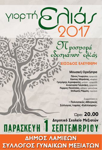 Ο Δήμος Λαμιέων και ο Σύλλογος Γυναικών Μεξιατών διοργανώνουν την «Γιορτή Ελιάς 2017» που θα πραγματοποιηθεί την Παρασκευή 1 Σεπτεμβρίου 2017 και ώρα 20:00 στο Δημοτικό Σχολείο Μεξιατών.
