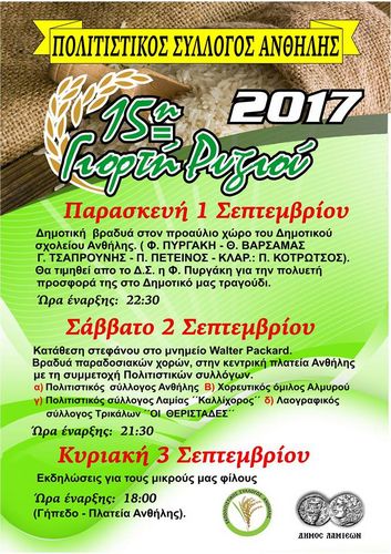 Ο Δήμος Λαμιέων και ο Πολιτιστικός Σύλλογος Ανθήλης διοργανώνουν την «15η Γιορτή Ρυζιού 2017» που θα πραγματοποιηθεί από την Παρασκευή 1 Σεπτεμβρίου έως την Κυριακή 3 Σεπτεμβρίου 2017 στην Τοπική Κοινότητα Ανθήλης.
