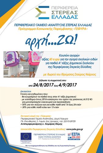 Την παροχή έκτακτου οικονομικού βοηθήματος για τους μαθητές της Α' τάξης Δημοτικού της Στερεάς Ελλάδας ανακοίνωσε ο Περιφερειάρχης Κώστας Μπακογιάννης, στο πλαίσιο υλοποίησης του προγράμματος κοινωνικής παρέμβασης "Γέφυρα".