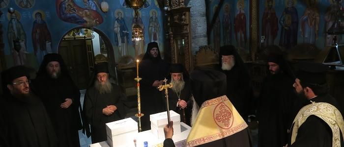 Προ της ενάρξεως της διαδικασίας των εκλογών, ο Σεβασμιώτατος πλαισιούμενος από τους πατέρες της αδελφότητος ετέλεσε τρισάγιο εντός του καθολικού, υπέρ αναπάυσεως της ψυχής του μακαριστού Καθηγουμένου γέροντος π. Δαμασκηνού.