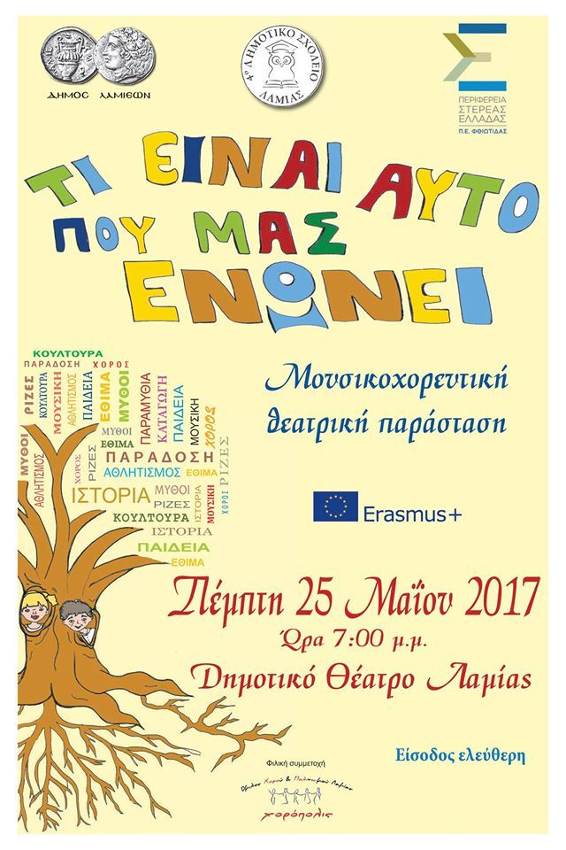 Μουσικοχορευτική θεατρική παράσταση με τίτλο «Τι είναι αυτό που μας ενώνει» διοργανώνει ο Δήμος Λαμιέων, η Περιφέρεια Στερεάς Ελλάδας και το 4ο Δημοτικό Σχολείο Λαμίας την Πέμπτη 25 Μαΐου και ώρα 7.00 μ.μ. στο Δημοτικό Θέατρο Λαμίας.