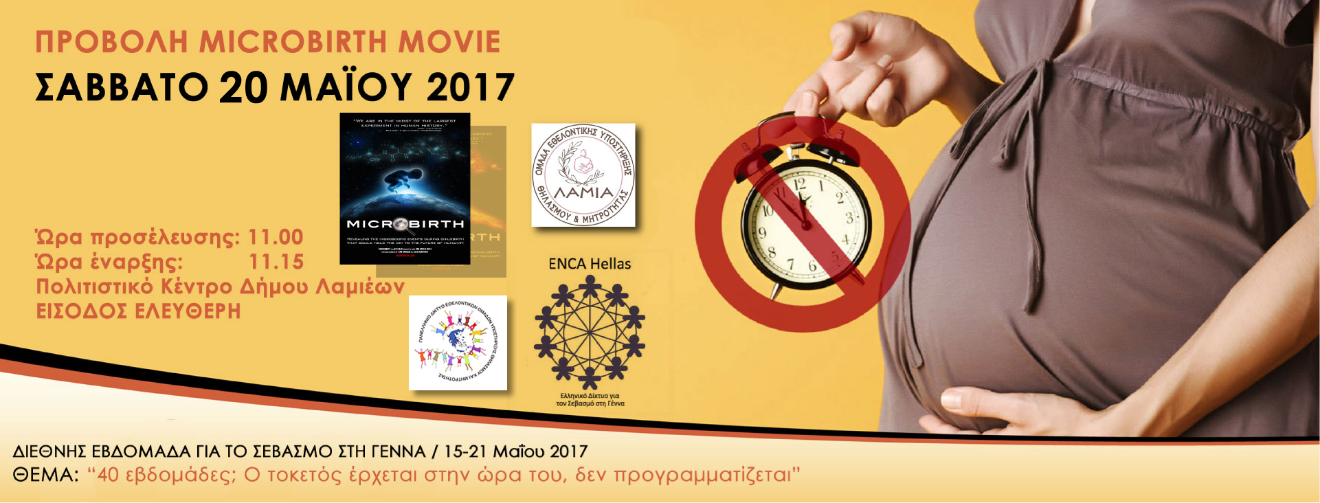 Η Εθελοντική Ομάδα Υποστήριξης Μητρικού Θηλασμού και Μητρότητας Λαμίας σε συνεργασία με το Ελληνικό Δίκτυο Σεβασμού στη γέννα ENCA Hellas και το Πανελλήνιο Δίκτυο Εθελοντικών Ομάδων Μητρικού Θηλασμού και Μητρότητας διοργανώνουν την προβολή του βραβευμένου ντοκυμαντέρ Microbirth Movie.