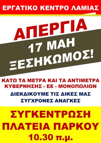 Το Εργατοϋπαλληλικό Κέντρο Λαμίας καλεί όλους τους εργαζόμενους να πάρουν θέση μάχης απέναντι στη νέα ομοβροντία μέτρων της κυβέρνησης και των θεσμών με γενική απεργία την Τετάρτη 17 Μάη και συγκέντρωση στην πλατεία πάρκου στις 10:30 πμ.
