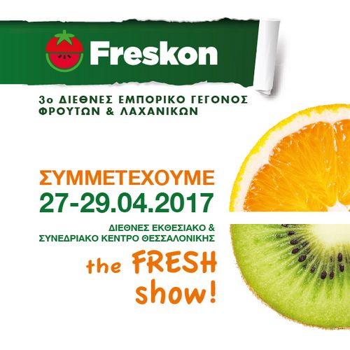 Η Περιφέρεια Στερεάς Ελλάδας ανακοινώνει τη συμμετοχή της στην έκθεση για τα φρέσκα φρούτα και τα λαχανικά «FRESKON 2017», που θα πραγματοποιηθεί από 27 έως 29 Απριλίου στο Διεθνές Εκθεσιακό Κέντρο της ΔΕΘ ΗΕLEXPO στη Θεσσαλονίκη.