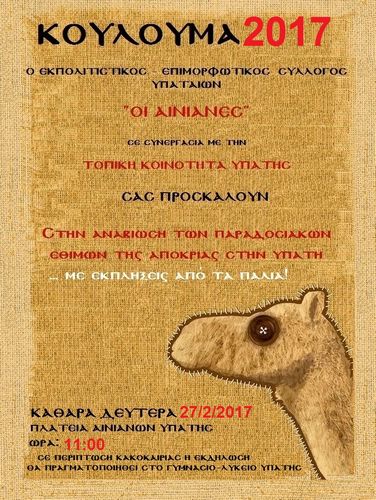 «Καλώς την Σαρακοστή… την Καθαρή Δευτέρα» θα τραγουδήσουν και φέτος «οι Αινιάνες», σε συνεργασία με την Τοπική Κοινότητα Υπάτης, αναβιώνοντας τα πατροπαράδοτα Κούλουμα στην κεντρική πλατεία της Υπάτης την Καθαρά Δευτέρα 27 Φεβρουαρίου 2017 και ώρα 11:00.