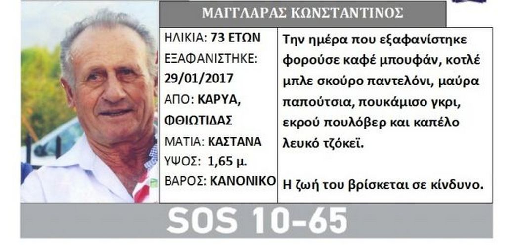 Αναστάτωση επικρατεί στην Υπάτη Φθιώτιδας μετά την εξαφάνιση ηλικιωμένου απο την περιοχή της Καρυάς .