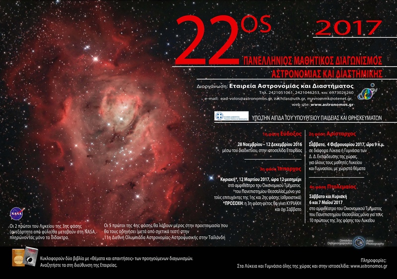 Με ιδιαίτερη χαρά ο ΣΕΑΦ θα συνδράμει και φέτος στη διεξαγωγή του 22ου Πανελλήνιου μαθητικού διαγωνισμού Αστρονομίας και Διαστημικής, σε συνεργασία με την Ε.Α.Δ. Βόλου.