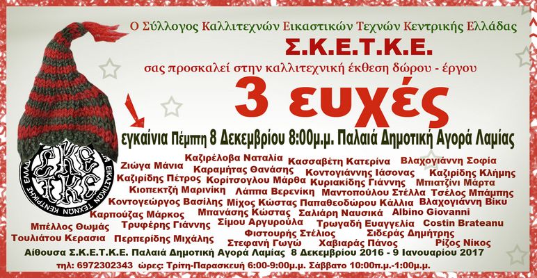 Ο σύλλογος Καλλιτεχνών Εικαστικών Τεχνών Κεντρικής Ελλάδας Σ.Κ.Ε.Τ.Κ.Ε, απευθύνει ανοικτή πρόσκληση στη Χριστουγεννιάτικη έκθεση εικαστικού δώρου-έργου που θα εγκαινιαστεί στην αίθουσα Σ.Κ.Ε.Τ.Κ.Ε. "Παλαιά Δημοτική Αγορά" Λαμίας την Πέμπτη 8 Δεκεμβρίου 2016 στις 8:00 το βράδυ.
