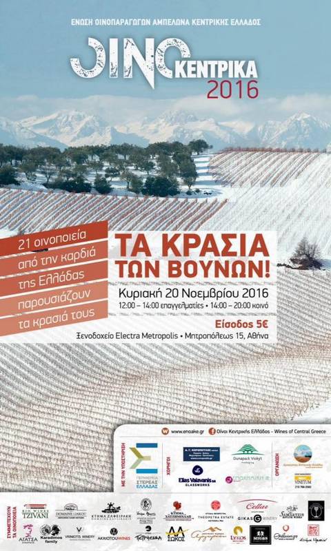 Τα κρασιά της Κεντρικής Ελλάδας θα παρουσιάσουν στο κοινό της πρωτεύουσας οι οινοποιοί τους, μέλη της Ένωσης Οινοπαραγωγών του Αμπελώνα της Κεντρικής Ελλάδας (ΕΝΟΑΚΕ), στην εκδήλωση γευσιγνωσίας «ΟινοΚεντρικά». Η εκδήλωση, που διοργανώνεται για πρώτη φορά, θα λάβει χώρα στο ξενοδοχείο Electra Metropolis (αίθουσα Magnolia), την Κυριακή 20 Νοεμβρίου 2016 (12:00 – 20:00).