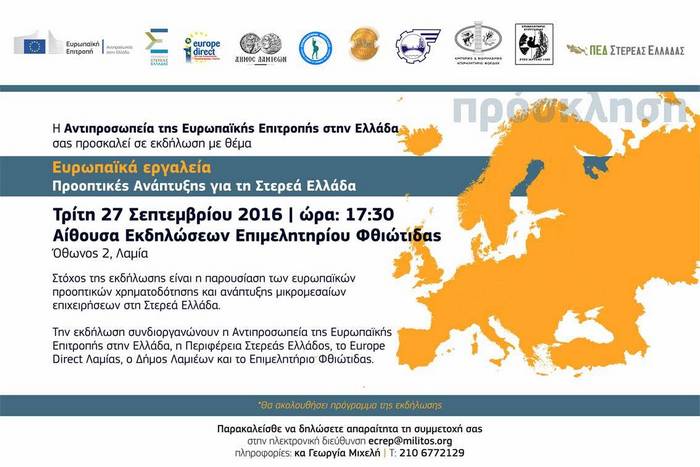 Εκδήλωση για «Ευρωπαϊκά εργαλεία- Προοπτικές Ανάπτυξης για τη Στερεά Ελλάδα» διοργανώνουν την Τρίτη 27 Σεπτεμβρίου 2016, η Αντιπροσωπεία της Ευρωπαϊκής Επιτροπής στην Ελλάδα, ο Δήμος Λαμιέων, η Περιφέρεια Στερεάς Ελλάδας, το Κέντρο Ευρωπαϊκής Πληροφόρησης Europe Direct Λαμίας και το Επιμελητήριο Φθιώτιδας.